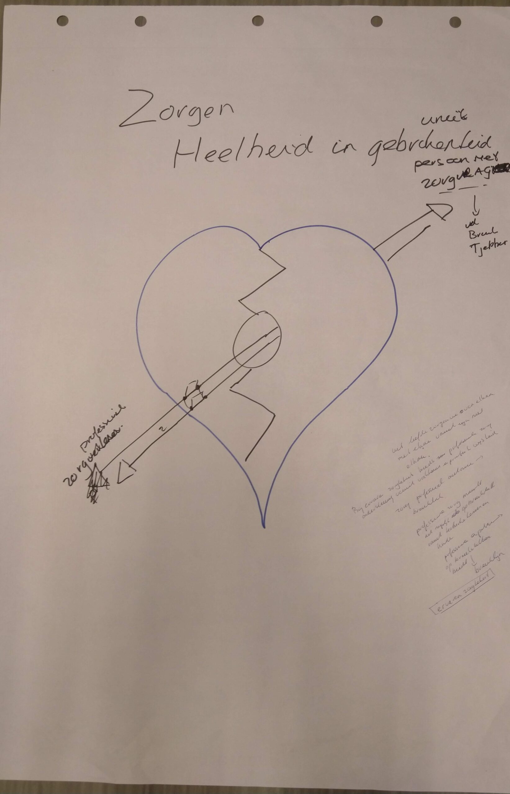 Tijdens een hackathon werd er in een groepje gewerkt aan moderne varianten van Jan Luyken tegels. Er werd samen tekst en beeld ontwikkeld bij het woord ‘zorgen’. Dit schetsontwerp is door Corinne Vorwerk uitgewerkt tot een kunstwerk in porselein.